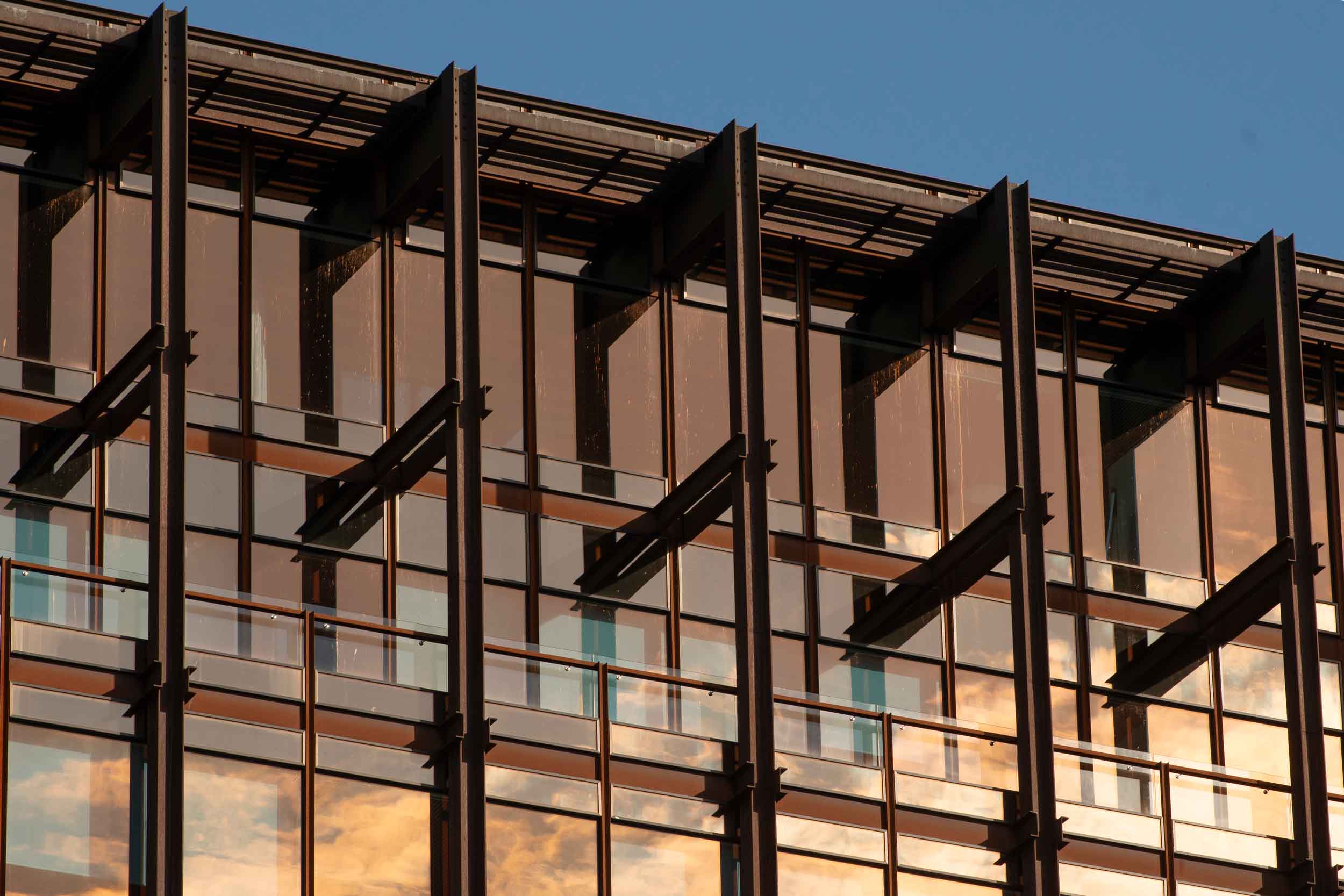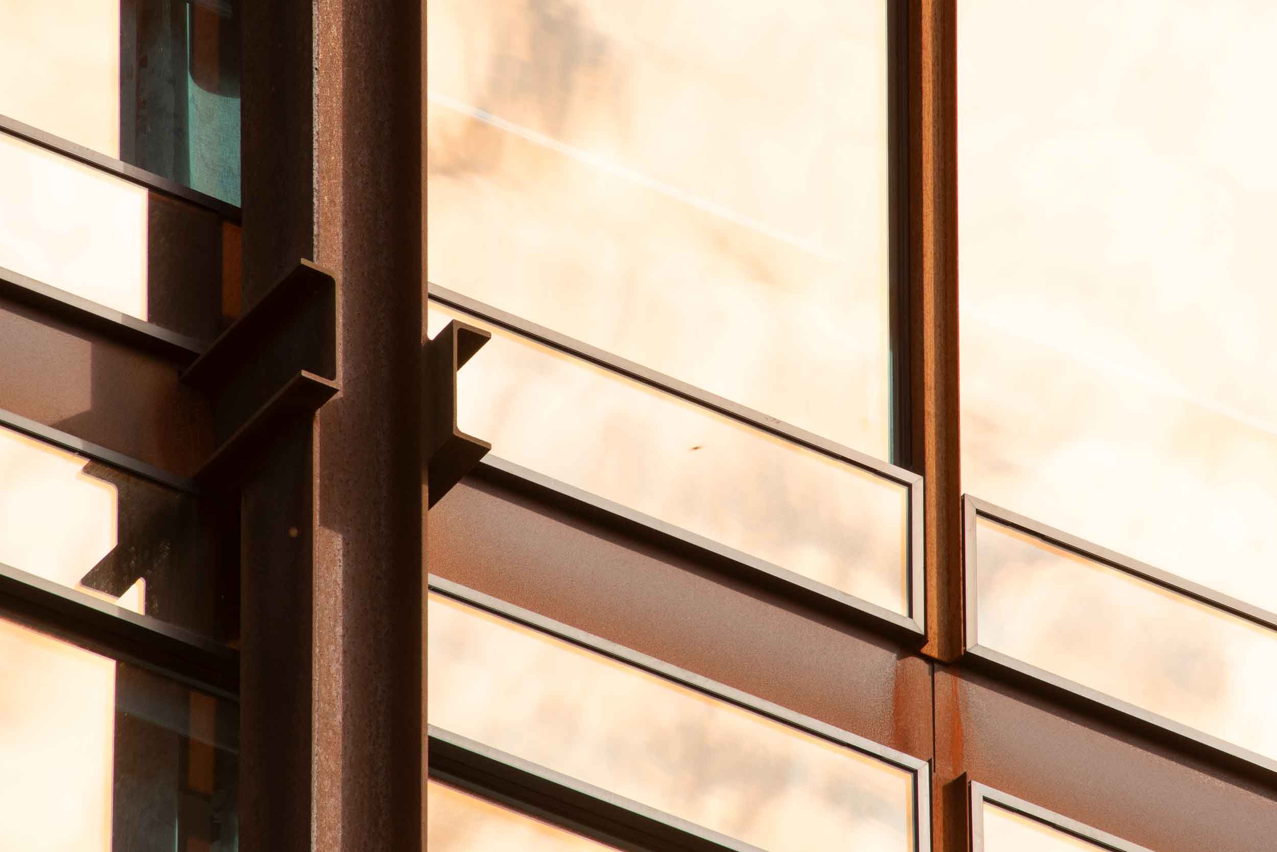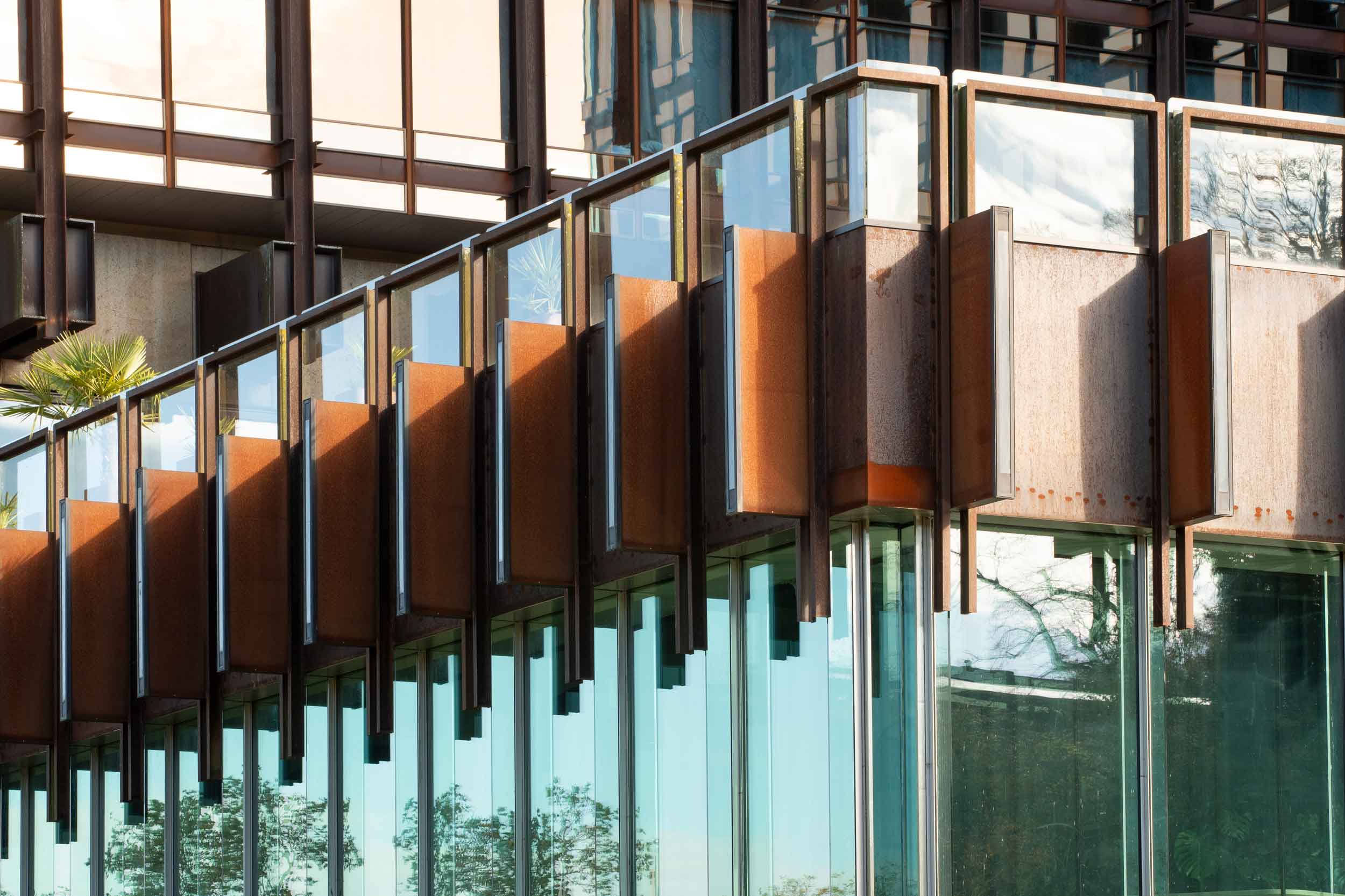 La façade extérieure d’origine en acier auto-patinable (‘corten’) a été conservée. L’intervention autour de laquelle le projet est construit est un vide circulaire créé au centre du plan. Le nouveau hall, d’un diamètre de près de 21 m et d’une hauteur de trois étages, s’articule entre les bâtiments avant et arrière, reliant le parking à l’hôtel et aux bureaux.