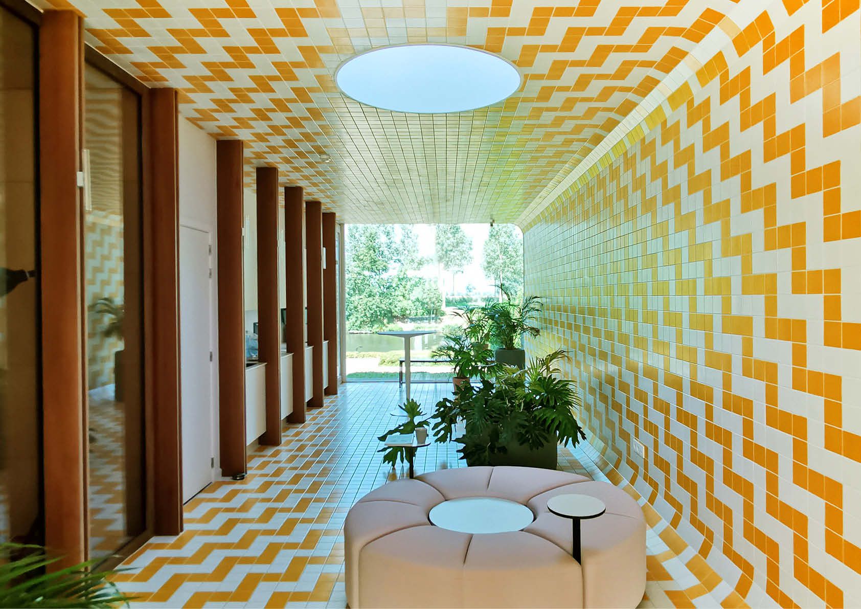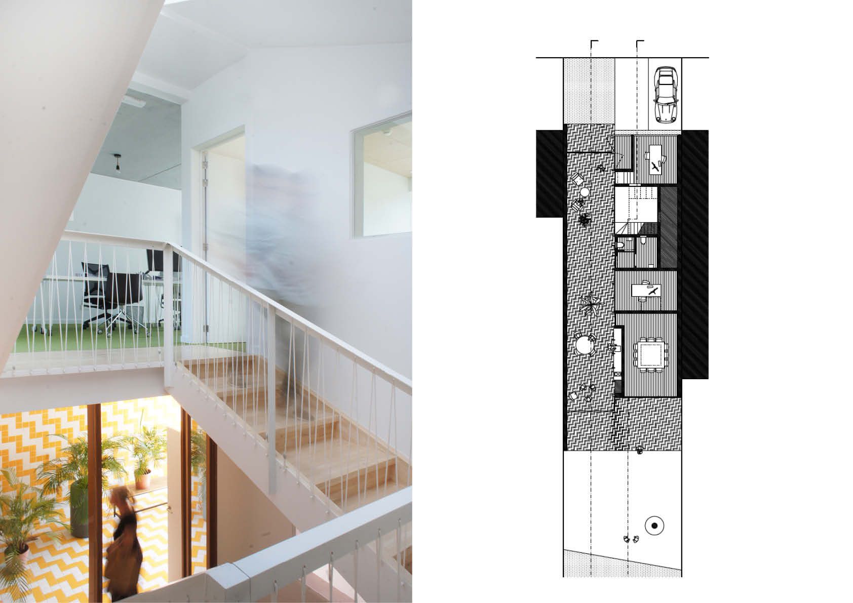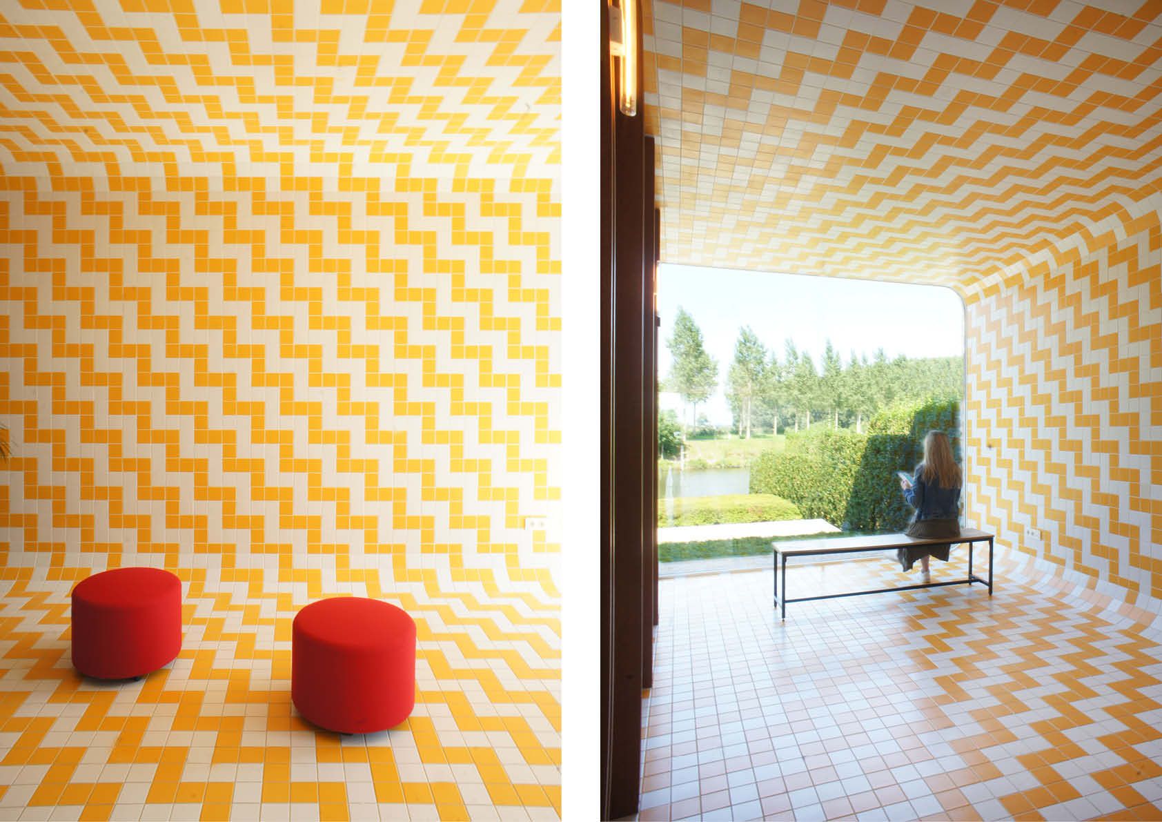 Une structure abstraite a été placée devant les façades, conférant au bâtiment son caractère et son apparence. D’une part, cette structure est indépendante de la façade, mais elle y est également fixée à certains endroits et est composée de profilés tubulaires peints en noir. Des plaquettes blanches laquées ont été posées sur ces derniers. L’ombre portée sur la façade arrière crée l’impression d’un jeu de blocs noirs et blancs qui se poursuit sur la façade latérale.