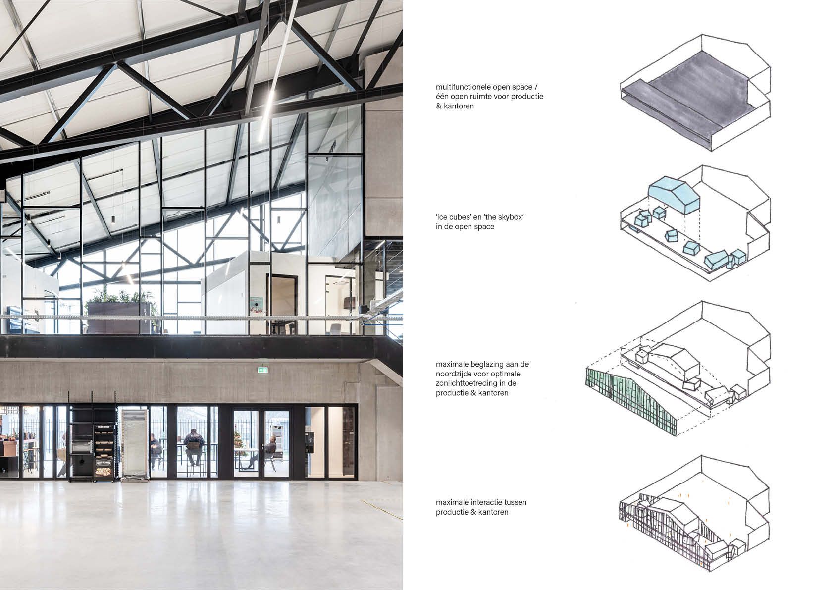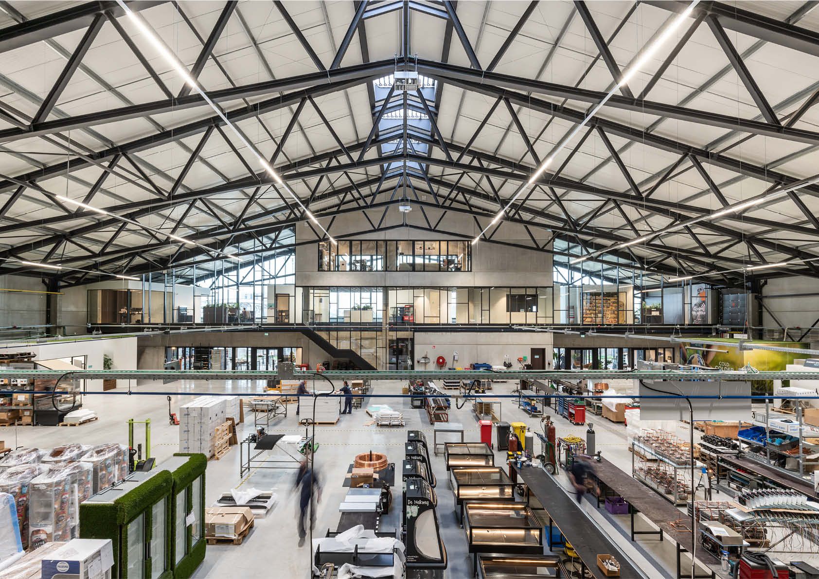 Les fermes en treillis métalliques nous ont également permis de créer de très grandes portées, de sorte que le hall de production est totalement dépourvu de colonnes et constitue un espace ouvert. C’est aussi une perspective d’avenir, parce que le bâtiment peut recevoir une nouvelle fonction sans avoir à subir de grandes modifications.