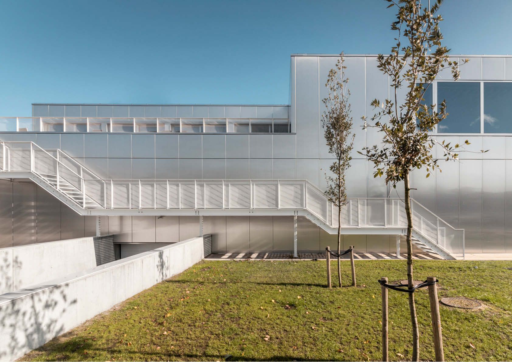 La structure modulaire en acier retenue pour les différents bâtiments hauts de deux ou trois étages, garantit le caractère uniforme et reconnaissable et permet des développements ultérieurs.