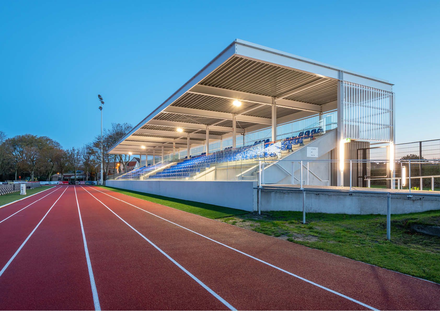 Partout, l’acier a été utilisé comme structure primaire. Des profilés et des caissons en I, HEA et HEB ont été utilisés pour les sols et les toits (tôle de toiture chaude, contreventements). La façade du stade de football abritant les bureaux, les locaux techniques, etc. a été entièrement revêtue d’acier perforé et de tôles ondulées. Les balustrades et les clôtures sont également en acier. Tout le métal a reçu un traitement spécial pour résister à l’air marin salé et corrosif.
