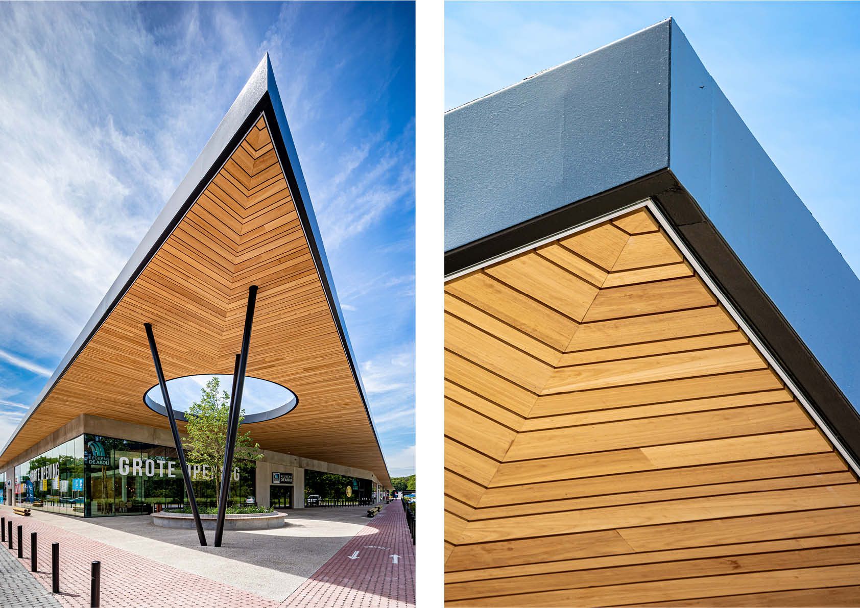 L’ancien site d’une entreprise de meubles à Zoersel a été transformé en un centre de shopping comprenant huit magasins. Afin de maintenir l’équilibre entre l’environnement naturel et les bâtiments, un auvent en acier remarquable et impressionnant de 17 mètres a été choisi. Une ouverture circulaire est prévue dans l’auvent dans lequel pousse un arbre de huit mètres de haut.