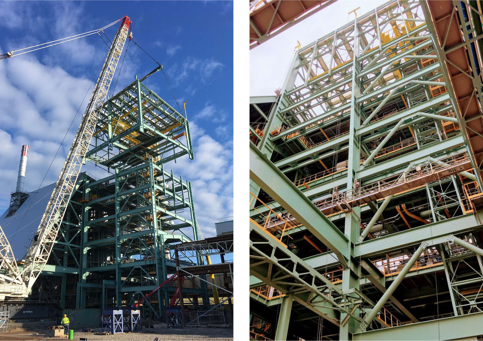 La tour se trouve sur une superficie de 23x25 m et a une hauteur de 60 m. Ici aussi, les 6 colonnes lourdes ont été soudées à partir de tôles. Pour les divers étages (de processus), des profilés laminés ont été utilisés dans la plupart des cas. Les sols sont recouverts de tôles gaufrées et sont intégralement protégés par des mains courantes. Au total, environ 2 500 tonnes d’acier ont été utilisées. La fabrication a été entièrement effectuée dans les ateliers, après quoi toutes les pièces ont été transportées sur le chantier et assemblées sur place.