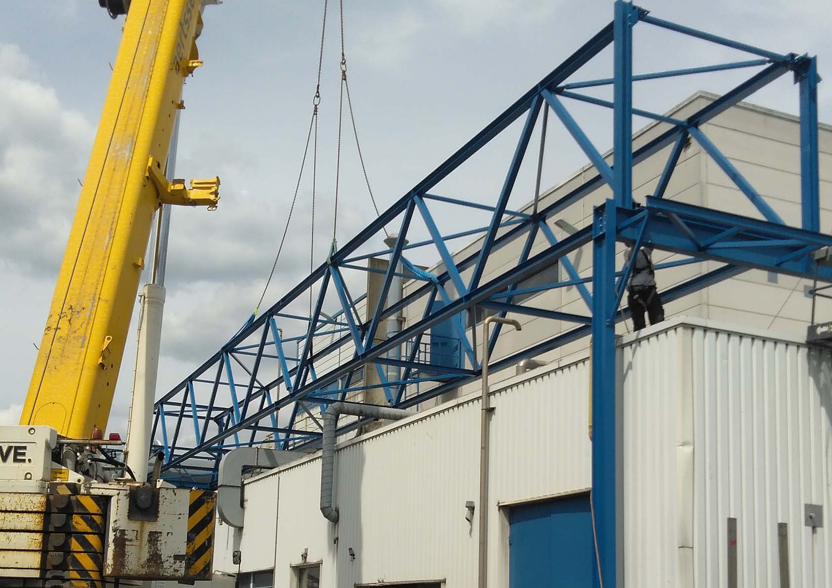 La première section se trouve au-dessus d'un bâtiment sur lequel on trouve un grand nombre de tuyaux, de plateformes, d'escaliers et d'échelles. La deuxième section passe au-dessus d'une passerelle de conduites existante et complètement indépendante de la nouvelle structure. L'exécution finale en treillis comprend 43,5 tonnes d'acier S235JR. L'ensemble a été métallisé et recouvert de deux couches de peinture RAL 5019. Les colonnes et les passerelles ont été préassemblées au sol, puis hissées en place à l'aide d'une grue lourde (140 tonnes).