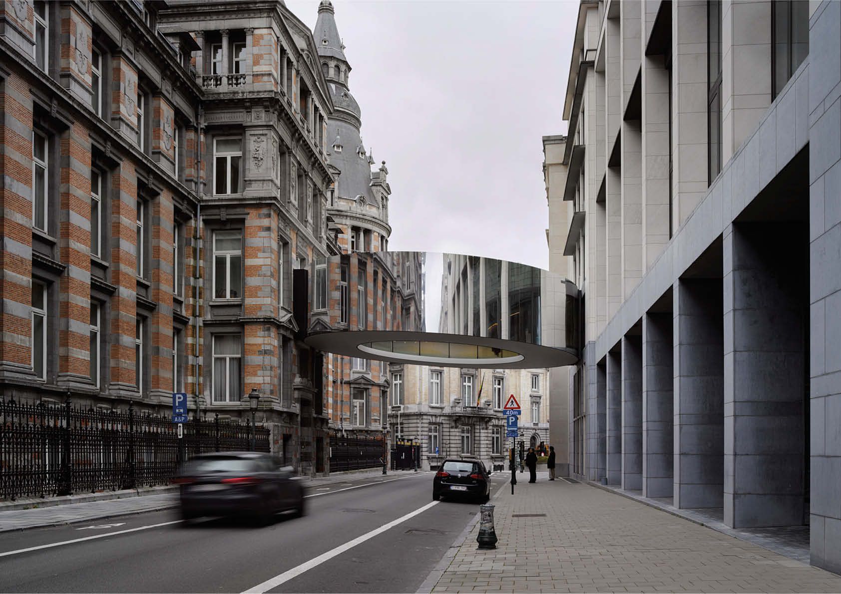 Les parlementaires fédéraux qui doivent se déplacer entre l’historique Palais de la Nation et le Forum, le nouveau complexe de conférences situé de l’autre côté de la rue, n’ont plus à le faire en plein air. Depuis peu, ils peuvent traverser par une jolie passerelle en forme d’anneau aux façades en miroir. Légèrement inclinée, la passerelle a été baptisée « Tondo » en référence aux peintures rondes très populaires à la Renaissance. Elle est en grande partie en acier.