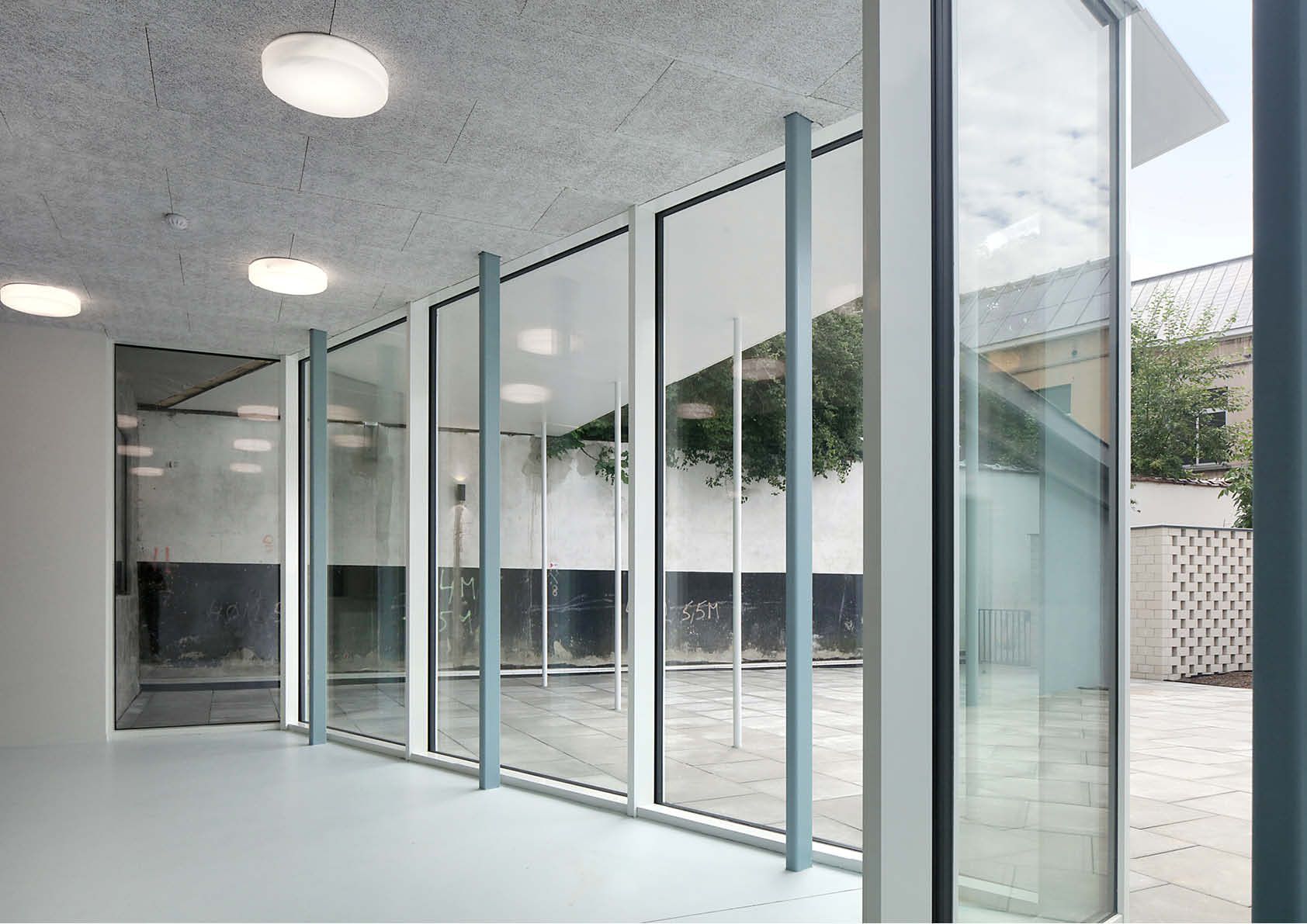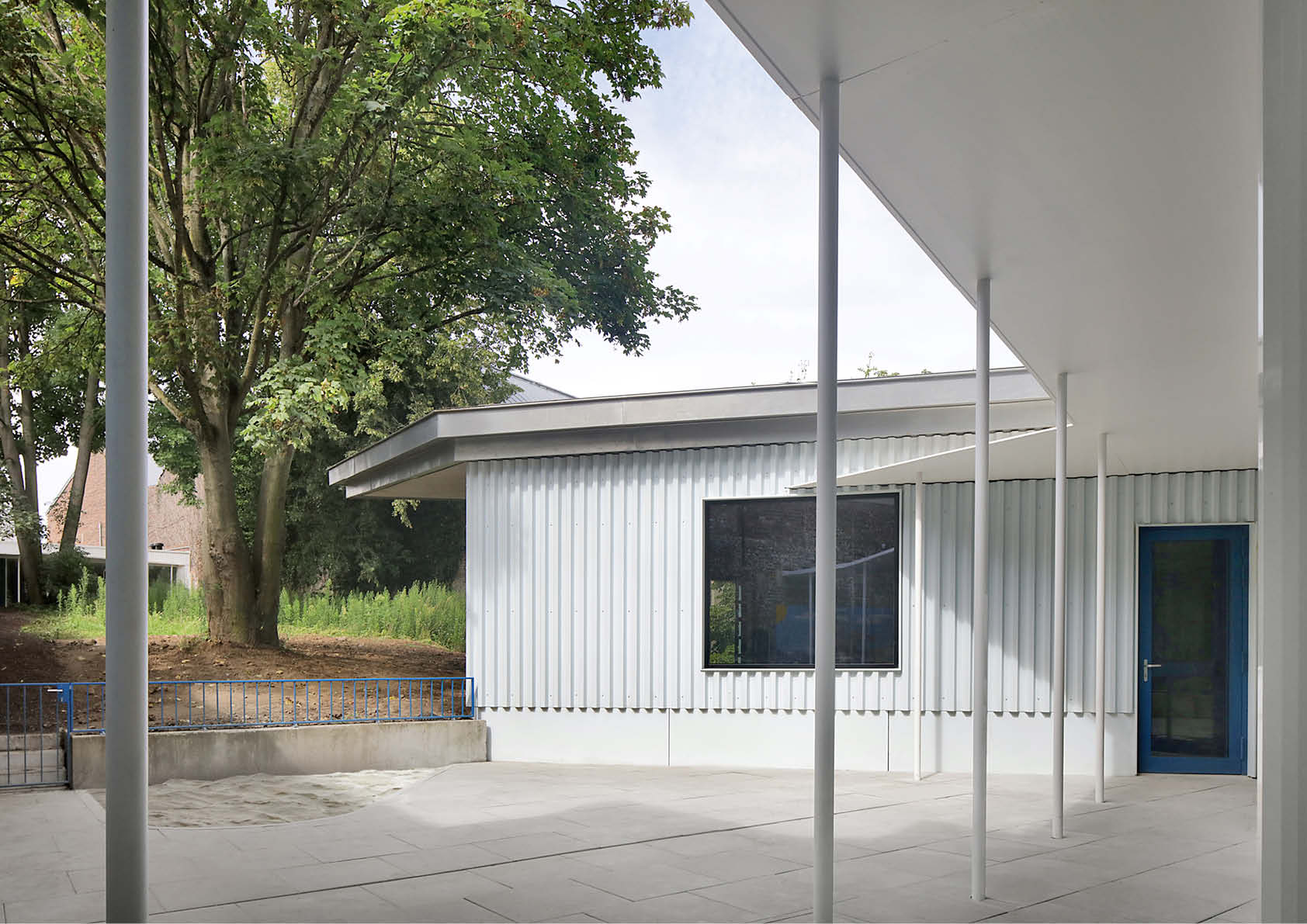 Toutes les sections de façade et tous les éléments spatiaux de l’espace public ont été réalisés avec les mêmes éléments en acier. Le bâtiment est soutenu par des colonnes en acier peintes en bleu clair. Un fin auvent en acier marque leur relation mutuelle et avec l’espace public.