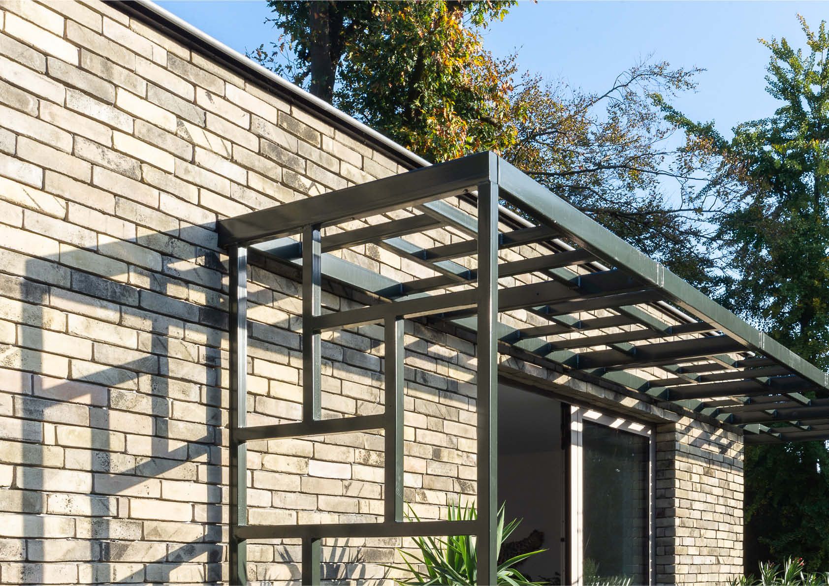 Grâce à sa forme, à l'utilisation judicieuse des matériaux et au choix spécifique des couleurs, cette maison unifamiliale, qui abrite également un bureau d’architecture, s'intègre parfaitement dans son environnement verdoyant. L'idée était d'éviter la surchauffe par les fenêtres vitrées orientées au sud et à l'ouest grâce à des plantes grimpantes, offrant ombre et fraicheur, sur trois auvents en acier. Ils se composent chacun de trois plans, divisés en segments avec un motif récurrent et suspendus entre des ailettes en acier fixées au gros oeuvre.