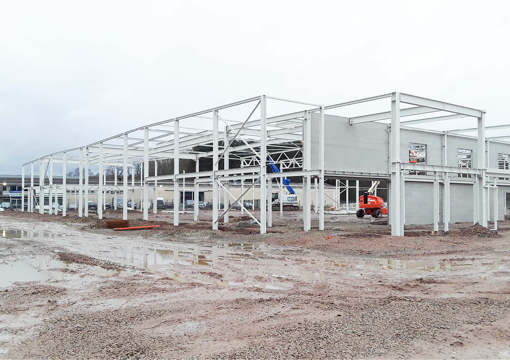 Comme le calendrier était très serré et que l’exécution devait être très rapide, une structure métallique complète a été privilégiée, tant pour les planchers des étages que pour la toiture (charpentes, poutres pleines, etc.). La façade a également été revêtue de 2150 m² de panneaux sandwichs en acier isolés et 4500 m² de panneaux de toiture en acier profilé ont été utilisés. Au total, pas moins de 215 tonnes d'acier ont été intégrées dans le bâtiment.