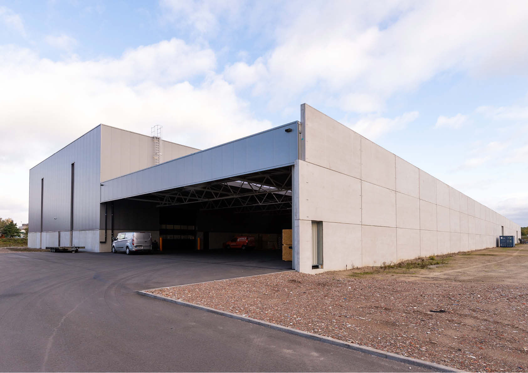 L’installation du hall a exigé une logistique impressionnante de la part de l’entrepreneur. Les poutres en treillis de 30 m de long ont dû parcourir le trajet entre Lommel et Genk.