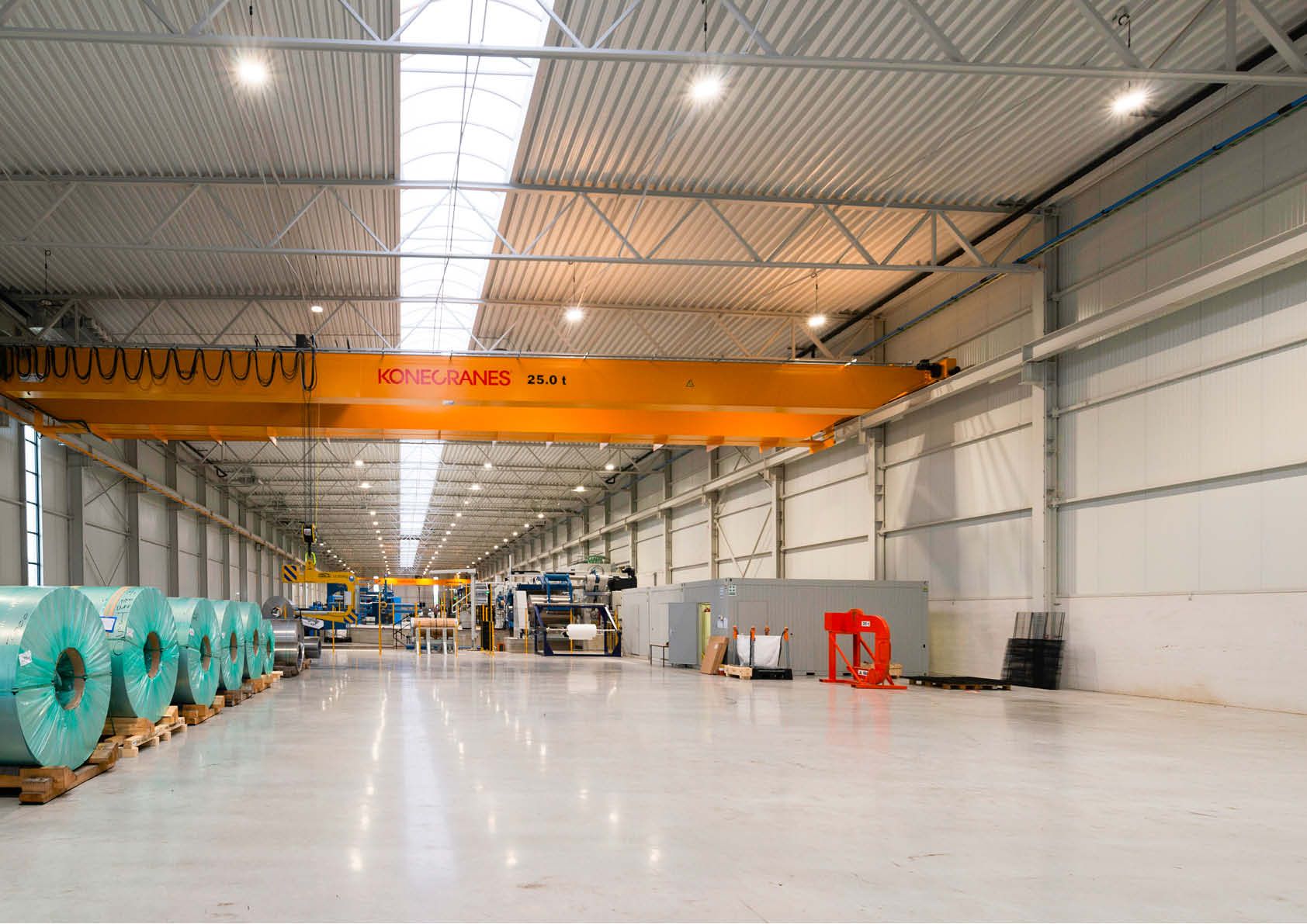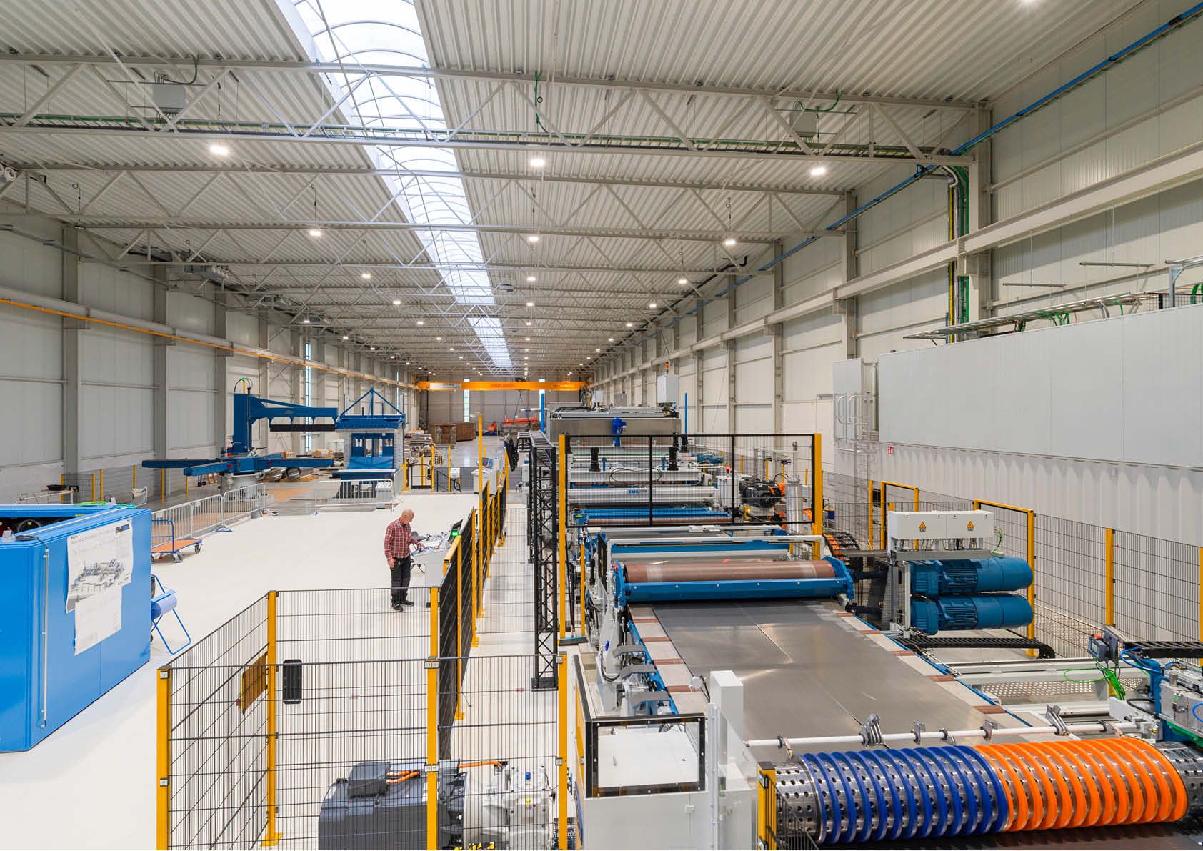 Les applications d’acier dans le cadre du projet concernent l’ensemble de la construction, comprenant des colonnes, des poutres en treillis, des rails de grue, le revêtement de façade constitué de panneaux sandwich isolés et de panneaux de toit profilés en acier.