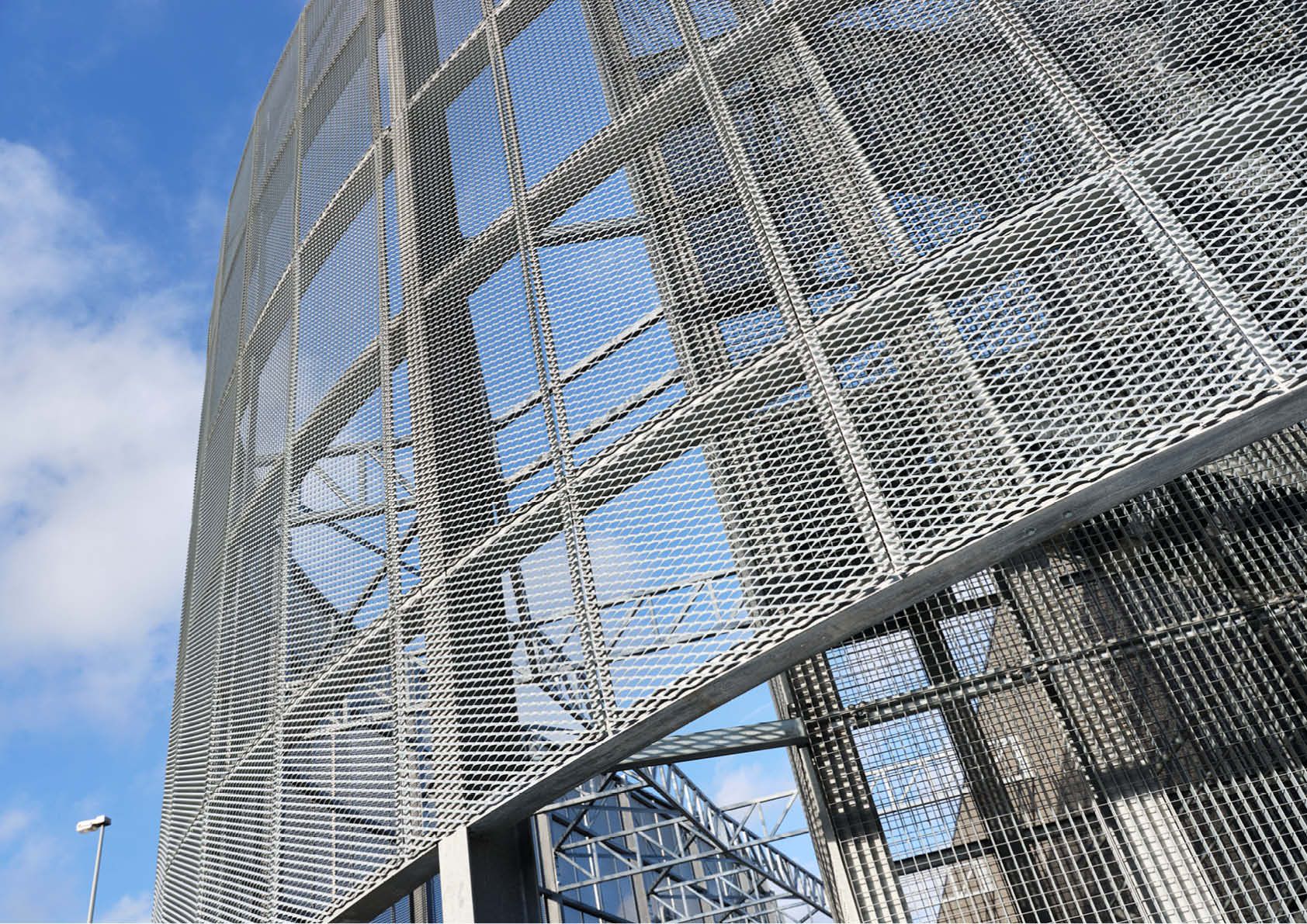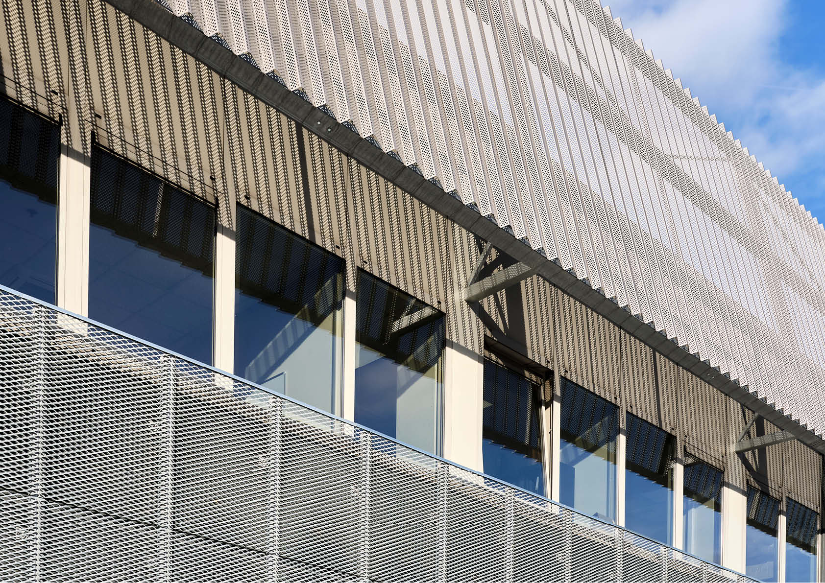 L'imposant auvent à l’entrée a été fini avec des tôles profilées er perforées d'ArcelorMittal.