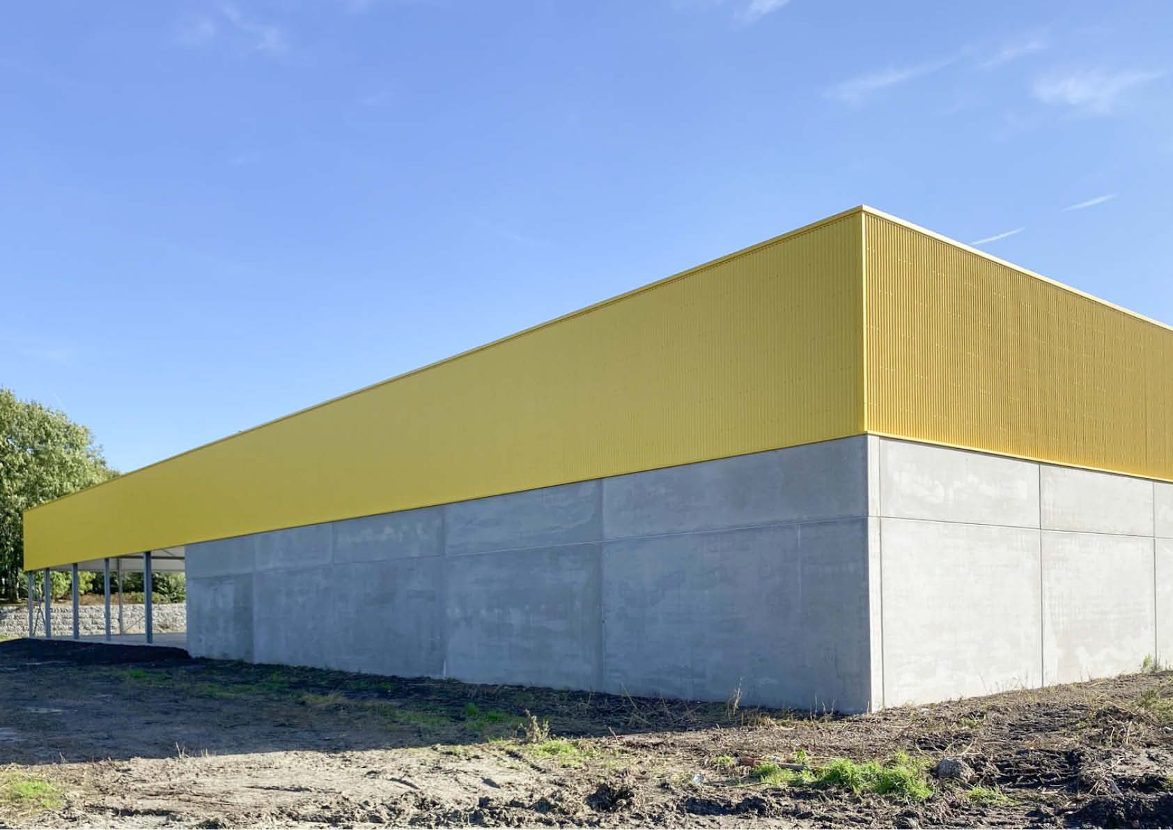 Le bâtiment se scinde en deux, avec le hangar d'un côté et l'auvent de l'autre. Au fond de l'abri, une "plinthe" en panneaux de béton forme un bel ensemble avec les blocs de béton pour le stockage du sel de voirie. Le volume supérieur du bâtiment s'étend comme un auvent au-dessus du parking où seront garées toutes les voitures de l'entreprise. Les tôles d'acier profilées procurent au bâtiment un aspect frais et contemporain. Les cadres de fenêtres et les portails en aluminium noir complètent le logo noir et jaune de Kapelle-op-den-Bos.