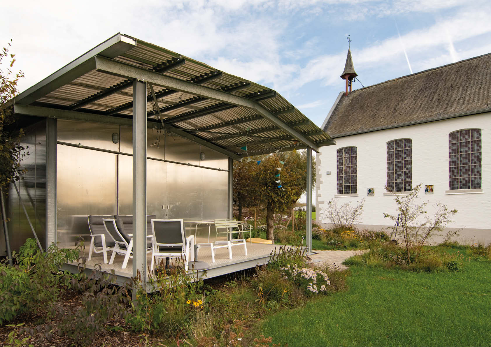 L'abri de jardin, qui repose sur une charpente métallique flottante, est construit en profilés d'acier laminés et formés à froid. La toiture et la façade sont recouvertes de tôles d'aluminium ondulé et de bardages.