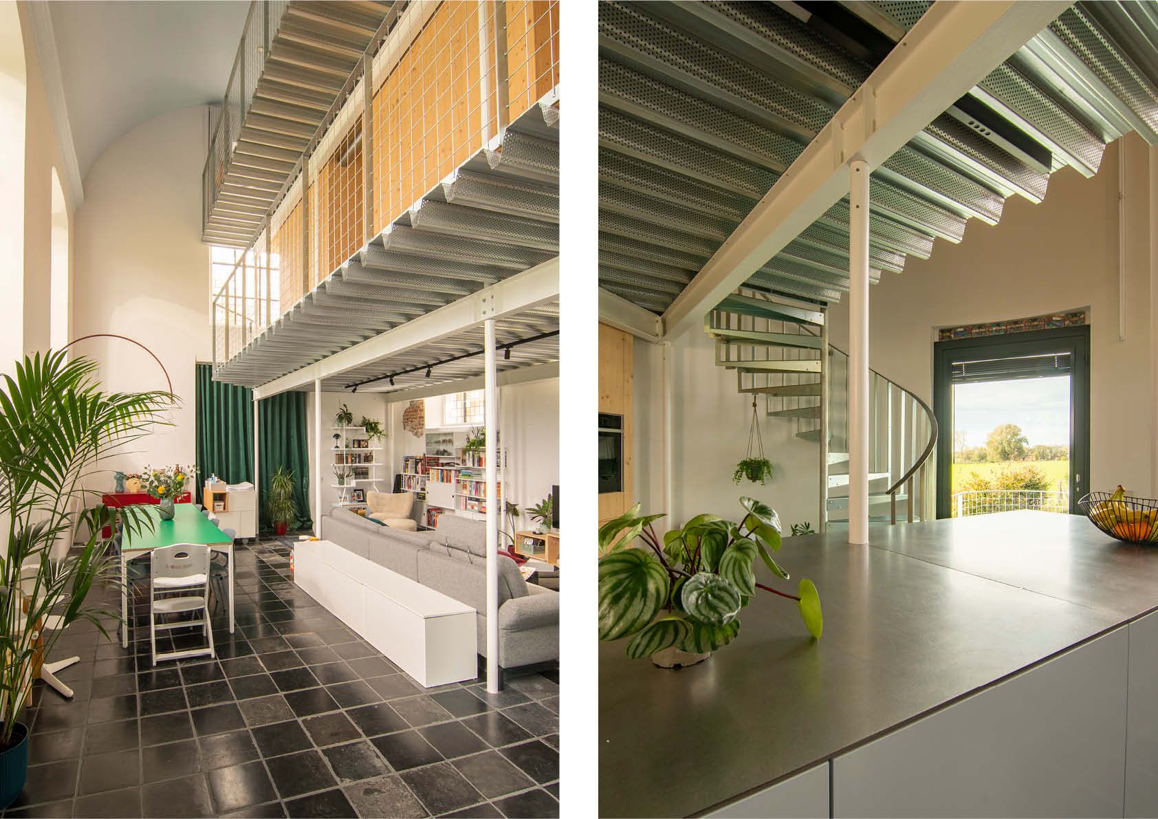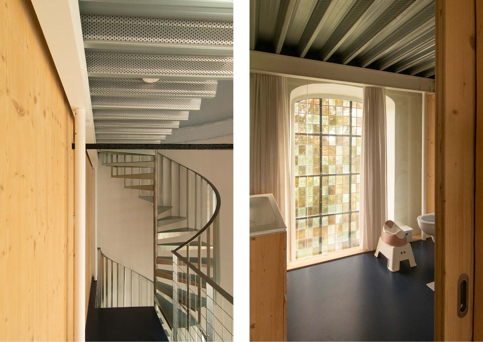 Deux planchers intermédiaires en acier profilé sont en porte-à-faux au-dessus d'une structure de porche sur l'axe central de la chapelle. Le chœur semi-circulaire, l'ancienne porte d'entrée, les bordent avec précision. Un mince escalier en acier en colimaçon aux marches plissées relie les différents étages. Une nouvelle porte unique dans le chœur rompt le caractère fermé de la chapelle et offre une vue étendue sur les champs situés derrière. La structure légère en acier est dissociée des murs et est fixée de façon minimale au bâtiment existant.