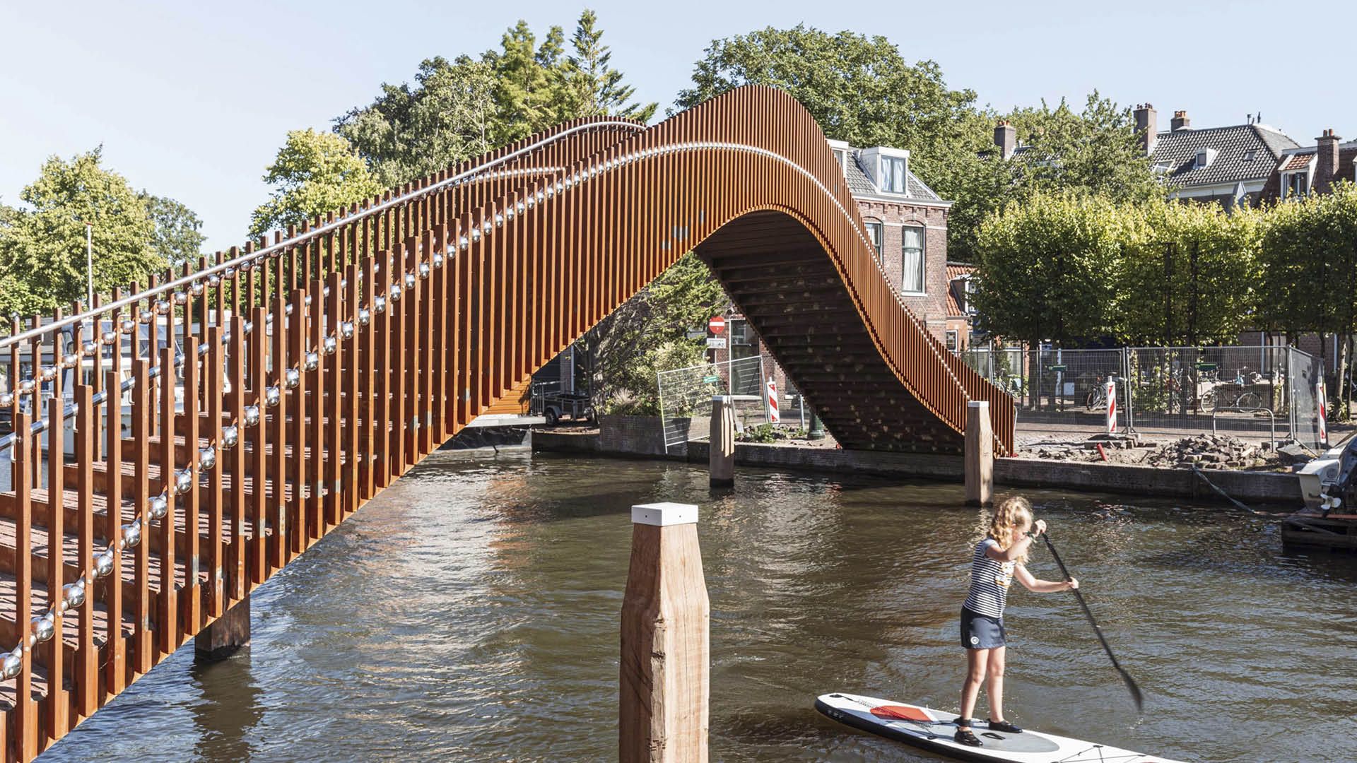 Le tablier est rempli de pavés cuits, fréquemment utilisés dans le centre ville de Leiden. Les trois matériaux différents nécessitent un entretien relativement faible et un processus de vieillissement indulgent, tout comme ceux du parc lui-même.