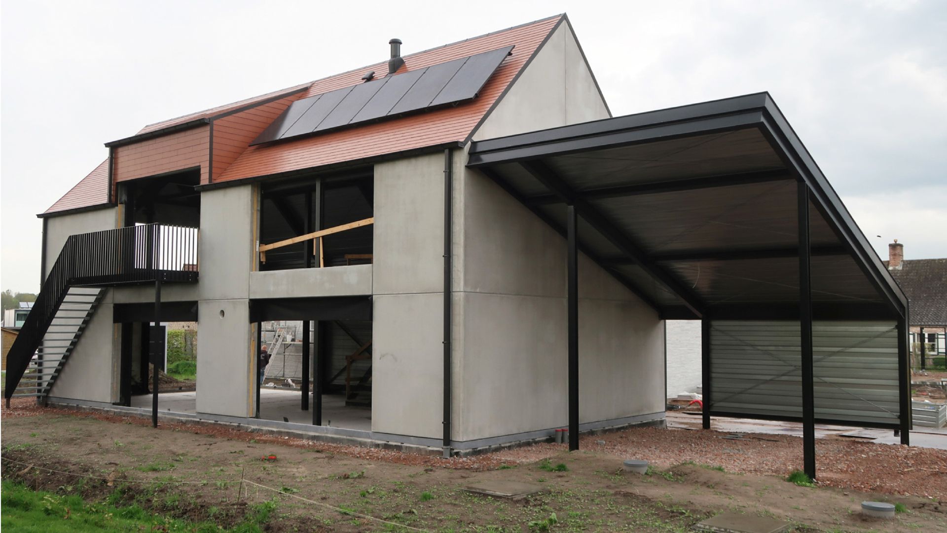 Derrière un carport accueillant se dresse une maison à ossature métallique plutôt introvertie, avec deux faces nettement différentes par rapport à la courbe de la rue. La méthode de construction industrielle est combinée avec des éléments et des finitions plutôt traditionnels.