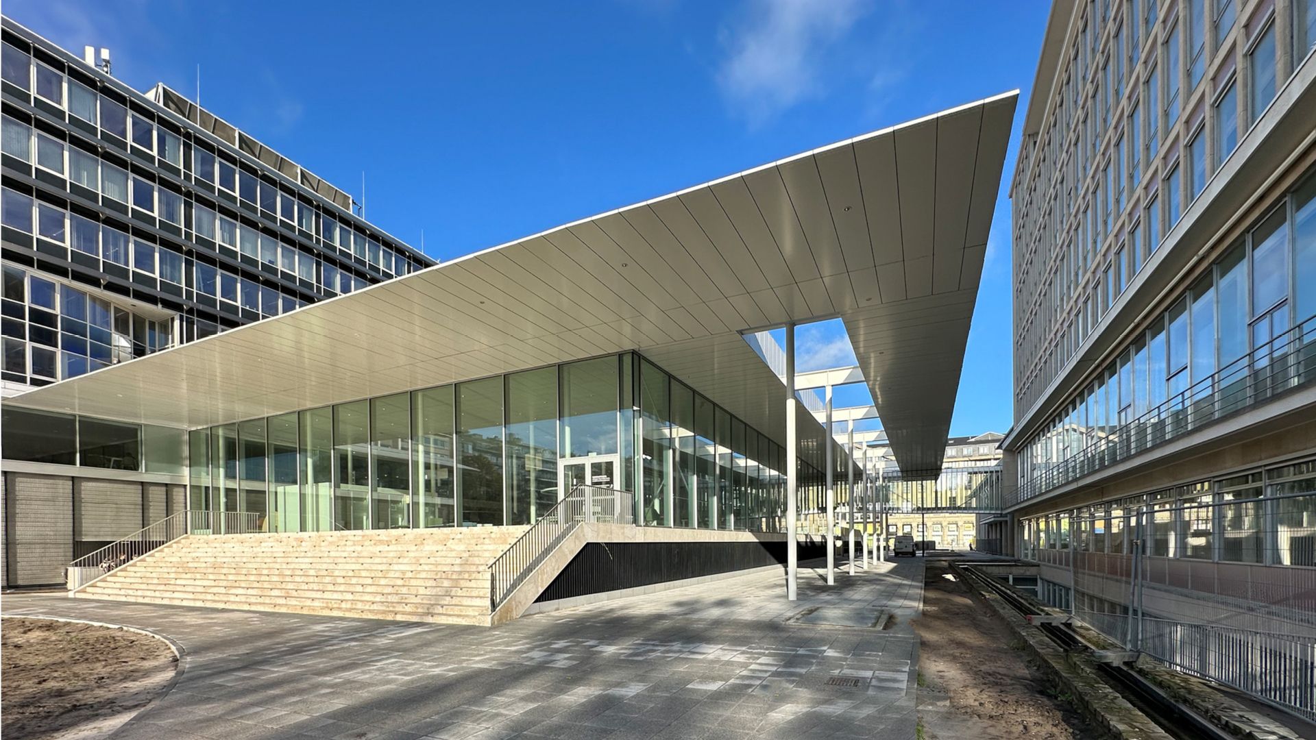 Une structure de toit complexe avec des poutres primaires et secondaires sur des colonnes de 6 m de haut tous les 7,2 m repose sur un socle (le parking à vélos) construit au-dessus d'un parking souterrain existant. Soutenir la structure métallique de la toiture et des auvents (55x34 m) sur 35 colonnes très élancées est une prouesse en termes d'étude de stabilité. De plus, compte tenu de la présence d'un mur-rideau composé de panneaux de verre en profilés d'aluminium de 6 m de haut, la structure métallique de la toiture ne peut se dilater que de 3 mm sur toute sa longueur et sa largeur.