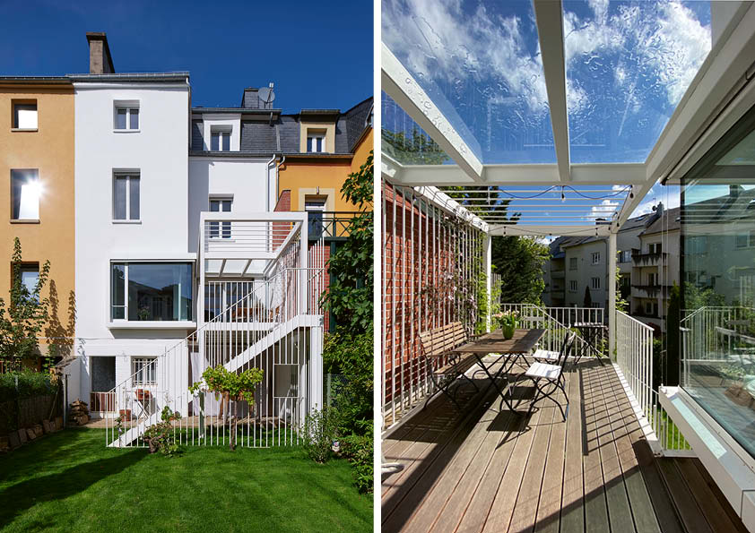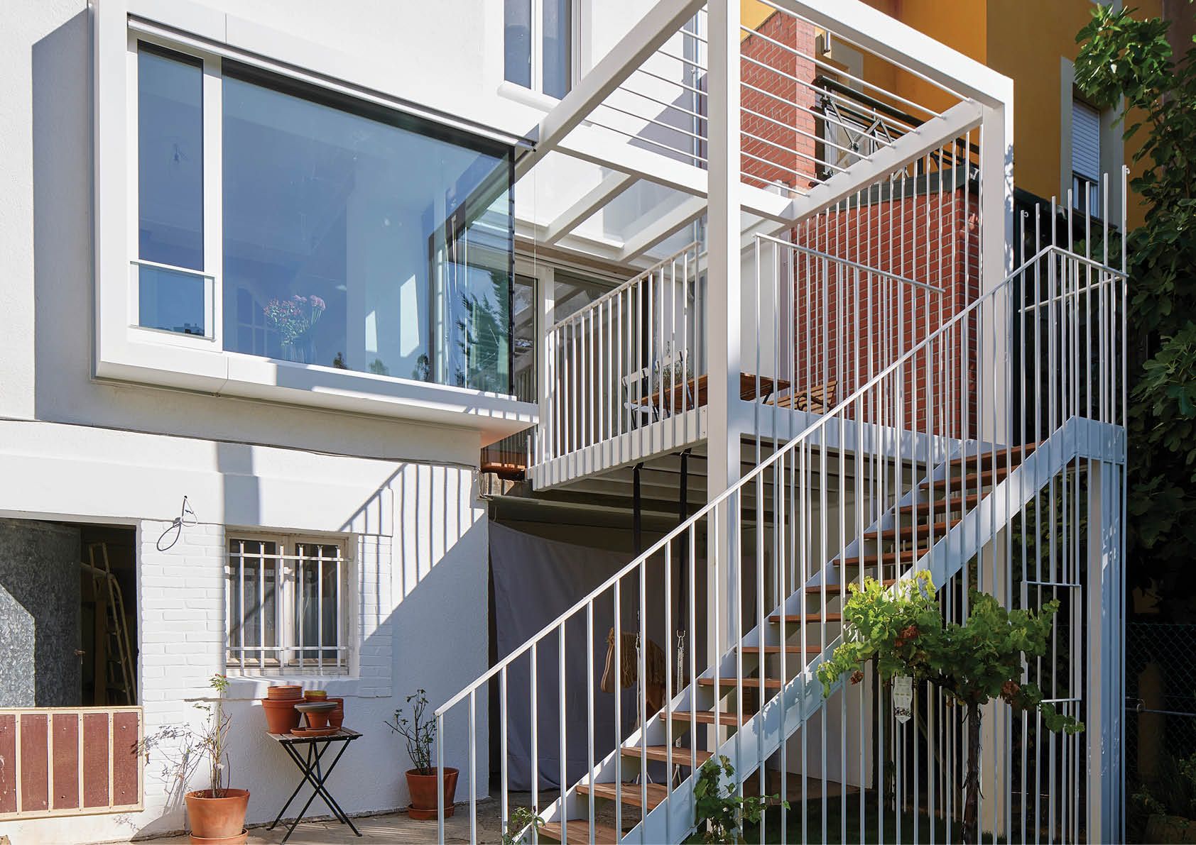 Deze smeedijzeren verandastructuur heeft de allure van een klein tuinpaviljoen. Het terras fungeert als een platform met twee niveaus. Beneden ontvouwt de ruimte zich tot een speelplek voor kinderen, inclusief een aan het gebouw bevestigde schommel, een ‘cottagesfeer’ en een raam dat uitzicht biedt op de tuin. De 1,5 ton zware structuur is geïnspireerd op het befaamde ‘Dom-Ino’-systeem van Le Corbusier en bestaat volledig uit S235-staal. Het gebruik van staal liet de ontwikkeling van een verfijnde, uitgepuurde structuur toe, waardoor er een slanke, rationele constructie ontstond. De prefabricage in het atelier zorgde ervoor dat het geheel snel en netjes gemonteerd kon worden op de werf. De verandastructuur heeft ook een uitzonderlijk lange levensduur dankzij de corrosiebestendige afwerking (verzinking en poedercoating).