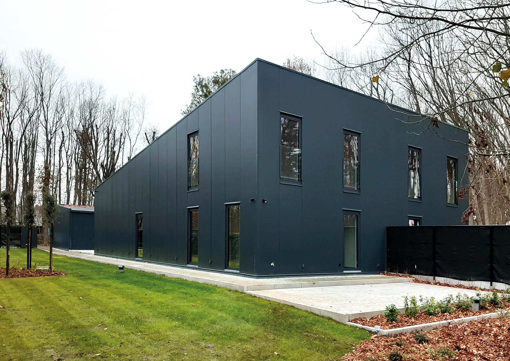 De keuze voor een staalstructuur lag dus voor de hand, ook om de uitvoeringsfase zo kort mogelijk te houden – het volledige bouwproces, van afbraak tot en met interieurafwerking, nam slechts negen maanden in beslag! – en vanwege economische en ecologische redenen (recyclage). Zowel de wanden als het dak zijn integraal bekleed met antracietgrijze industriële sandwichpanelen. De onderkant van de dakoversteken boven de beglaasde kopgevel, die oververhitting vermijden, en de wanden die aansluiten op de terrassen zijn dan weer afgewerkt met hout. Dit zorgt voor een fraai visueel contrast.